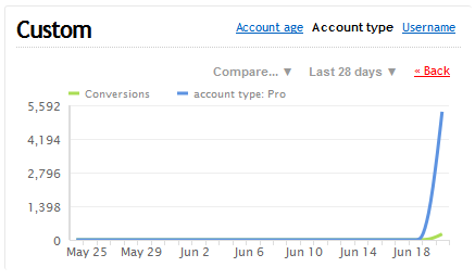 Last but not least, all of these items are graphable too. Just click the trend percentage next to any custom data in any report (main report, dashboard, goal report) to see its history over time. Of course, we’ve only been logging this data for our stats for about 24 hours so it’s not terribly exciting yet: